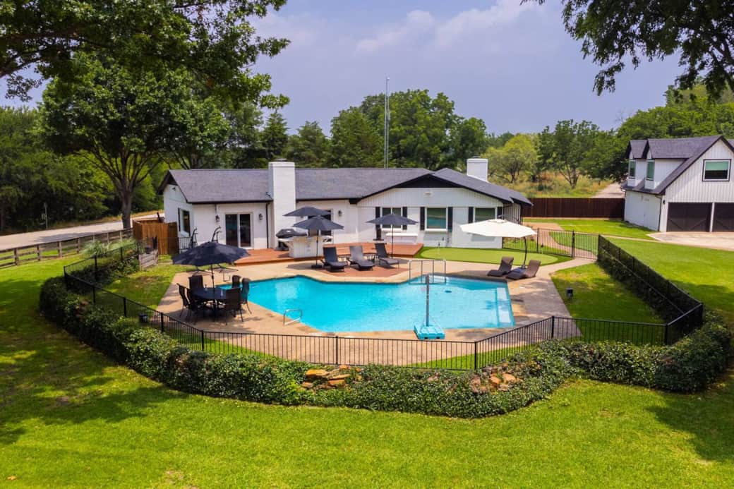 Backyard with 6 top table, 4 lounge chairs and 3 umbrellas.